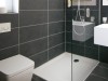 mit begehbarer Regendusche, Waschbecken und Föhn.